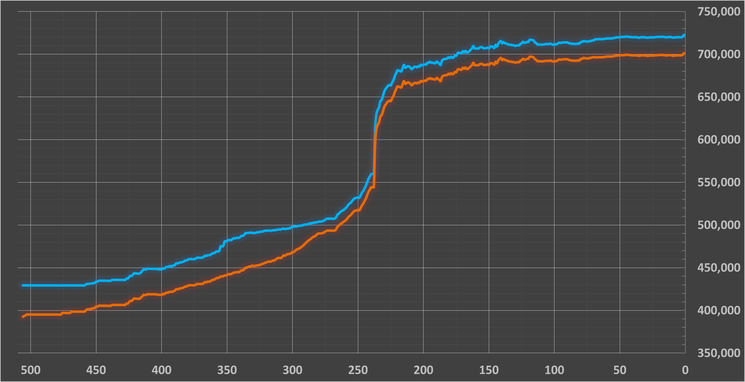 نمودار زیر روند افزایش قیمت اسکناس و حواله دلار آمریکا را در ۵۰۶ روز کاری گذشته نشان میدهد. نمودار آبی نرخ اسکناس و نمودار نارنجی نرخ حواله دلار است.